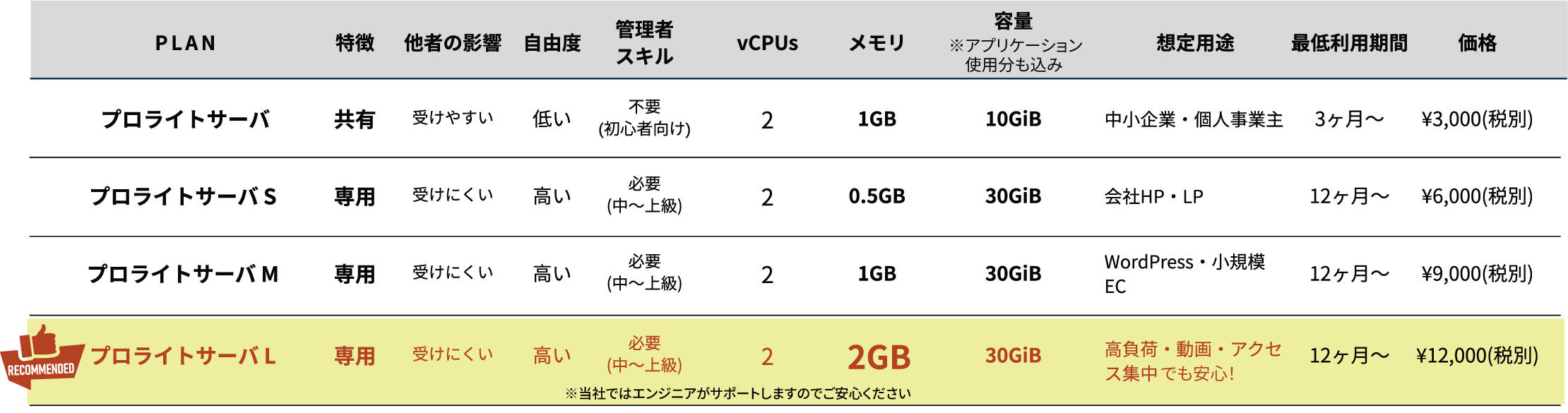 プロライトサーバは、ホームページ運用の規模や目的に合わせて4つのプランをご用意しています。初めてのホームページにも、安定稼働が求められる企業サイトにも対応可能です。